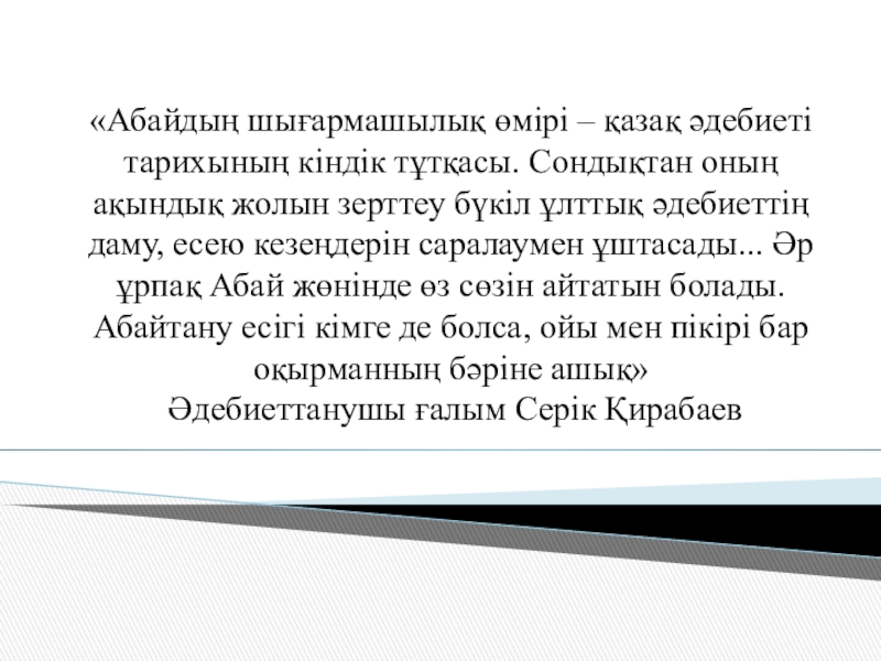 Слайд 7«Абайдың шығармашылық өмірі – қазақ әдебиеті тарихының кіндік тұтқасы. Сондықтан оның