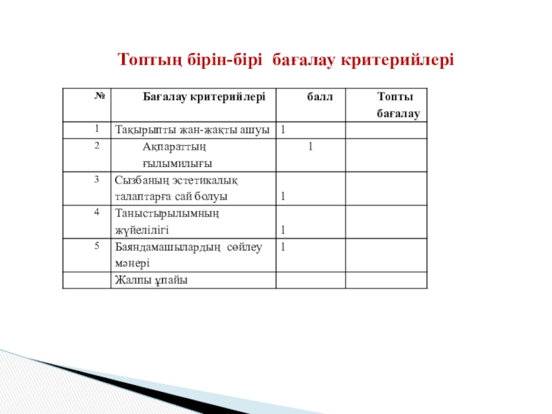 Слайд 9Топтың бірін-бірі бағалау критерийлері