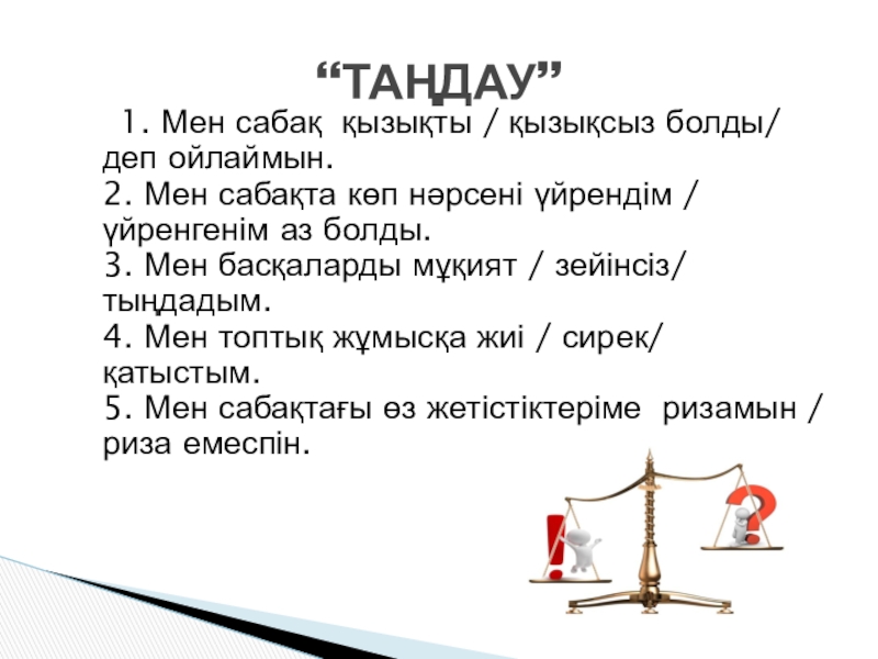 “ТАҢДАУ”  1. Мен сабақ қызықты / қызықсыз болды/ деп ойлаймын. 2. Мен сабақта көп нәрсені үйрендім