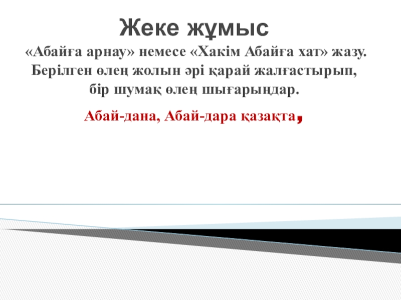Слайд 11Жеке жұмыс «Абайға арнау» немесе «Хакім Абайға хат» жазу. Берілген
