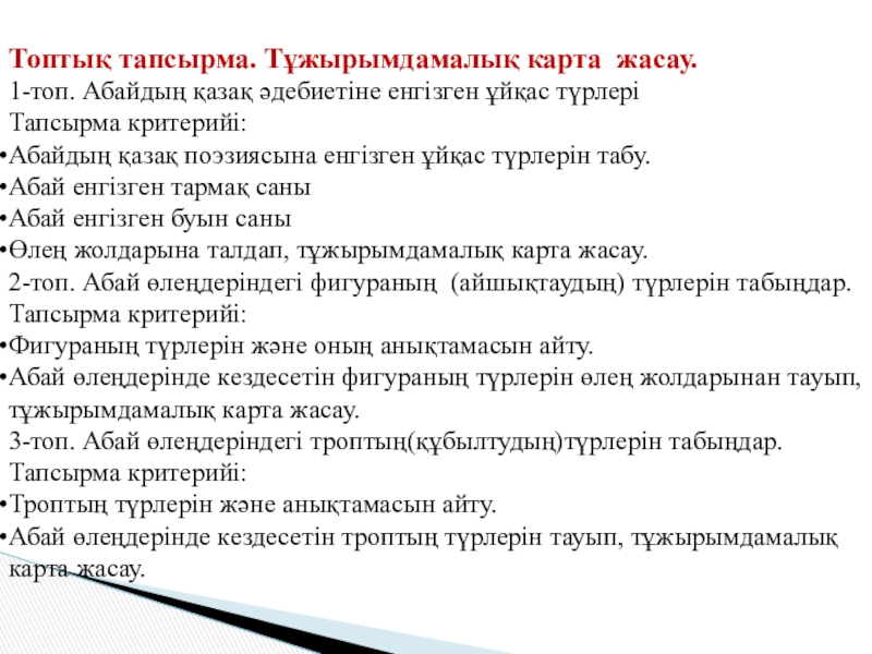 Топтық тапсырма. Тұжырымдамалық карта жасау.1-топ. Абайдың қазақ әдебиетіне енгізген ұйқас түрлеріТапсырма критерийі:Абайдың қазақ поэзиясына енгізген ұйқас түрлерін