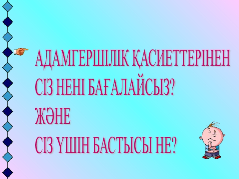 Слайд 6АДАМГЕРШІЛІК ҚАСИЕТТЕРІНЕН СІЗ НЕНІ БАҒАЛАЙСЫЗ? ЖӘНЕ СІЗ ҮШІН БАСТЫСЫ НЕ?