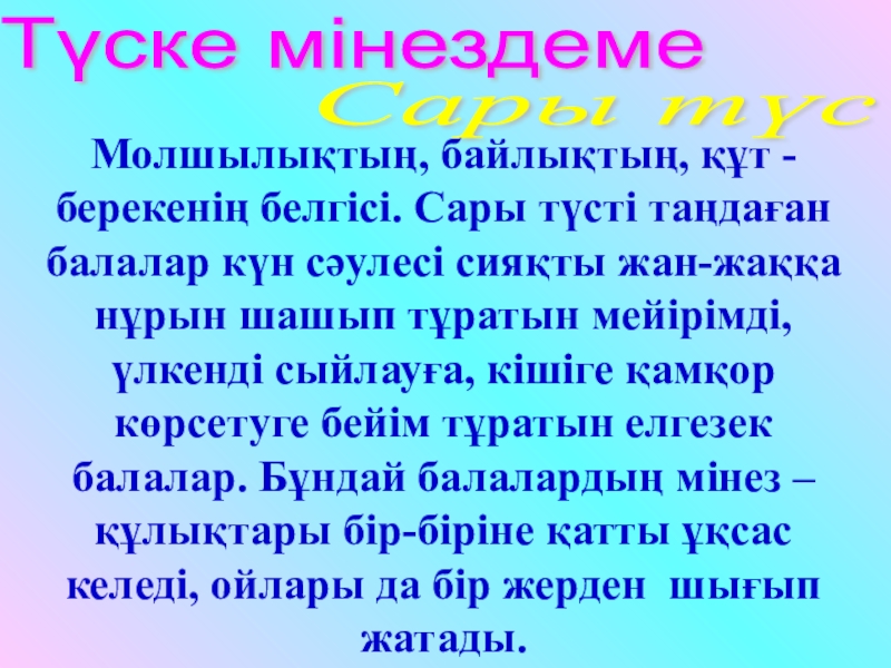Түске мінездеме Сары түсМолшылықтың, байлықтың, құт -берекенің белгісі. Сары түсті таңдаған балалар күн сәулесі сияқты жан-жаққа нұрын шашып тұратын мейірімді, үлкенді сыйлауға, кішіге қамқор көрсетуге бейім тұратын елгезек балалар. Бұндай балалардың мінез – құлықтары бір-біріне қатты