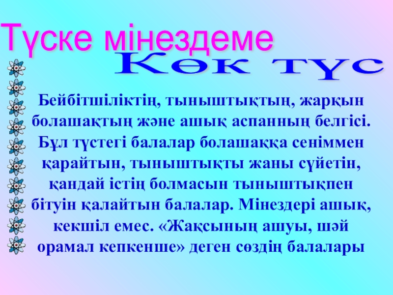 Түске мінездеме Көк түсБейбітшіліктің, тыныштықтың, жарқын болашақтың және ашық аспанның белгісі. Бұл түстегі балалар болашаққа сеніммен қарайтын,