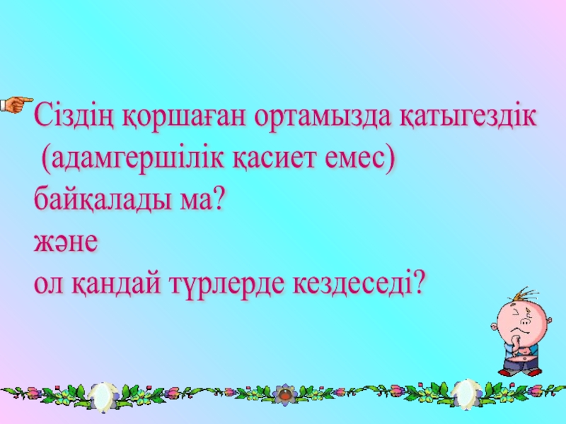 Слайд 9Сіздің қоршаған ортамызда қатыгездік (адамгершілік қасиет емес) байқалады ма? және