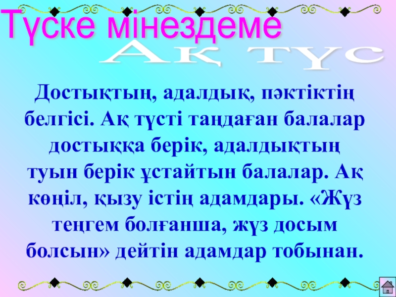 Түске мінездеме Ақ түсДостықтың, адалдық, пәктіктің белгісі. Ақ түсті таңдаған балалар достыққа берік, адалдықтың туын берік ұстайтын