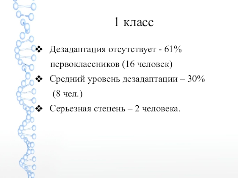 1 класс Дезадаптация отсутствует - 61%   первоклассников (16 человек) Средний уровень дезадаптации – 30%