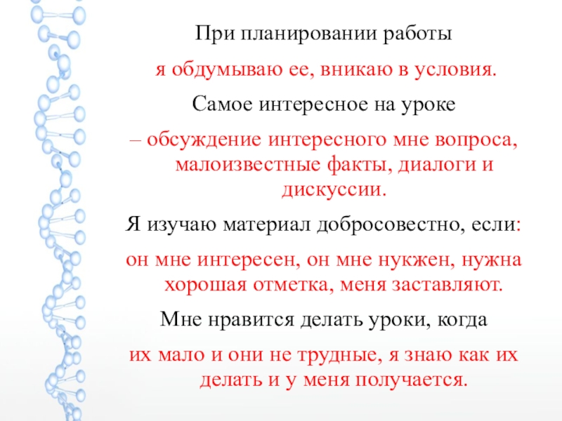 При планировании работы я обдумываю ее, вникаю в условия.Самое интересное на уроке – обсуждение интересного мне вопроса,