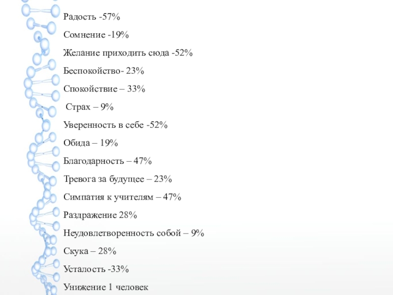 Радость -57%Сомнение -19%Желание приходить сюда -52%Беспокойство- 23%Спокойствие – 33% Страх – 9%Уверенность в себе -52%Обида – 19%Благодарность