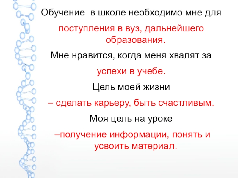 Обучение в школе необходимо мне дляпоступления в вуз, дальнейшего образования.Мне нравится, когда меня хвалят зауспехи в учебе.Цель