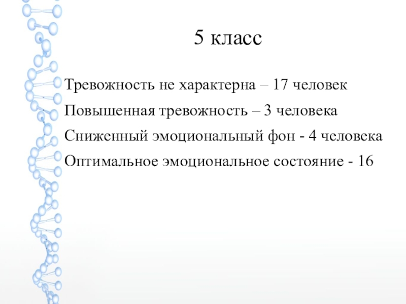 5 классТревожность не характерна – 17 человекПовышенная тревожность – 3 человекаСниженный эмоциональный фон - 4 человекаОптимальное эмоциональное