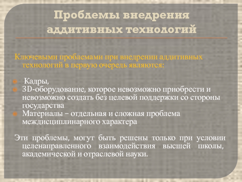 Проблемы внедрения аддитивных технологий Ключевыми проблемами при внедрении аддитивных технологий в первую очередь являются: Кадры, 3D-оборудование,