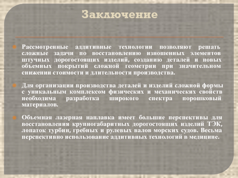 Заключение Рассмотренные аддитивные технологии позволяют решать сложные задачи по восстановлению изношенных элементов штучных дорогостоящих изделий, созданию деталей