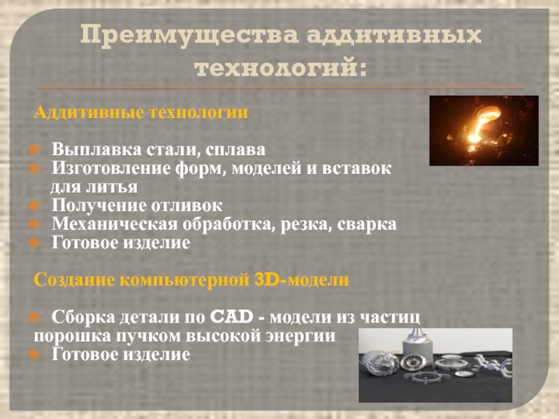 Преимущества аддитивных технологий: Аддитивные технологииВыплавка стали, сплаваИзготовление форм, моделей и вставок  для литьяПолучение отливокМеханическая обработка,