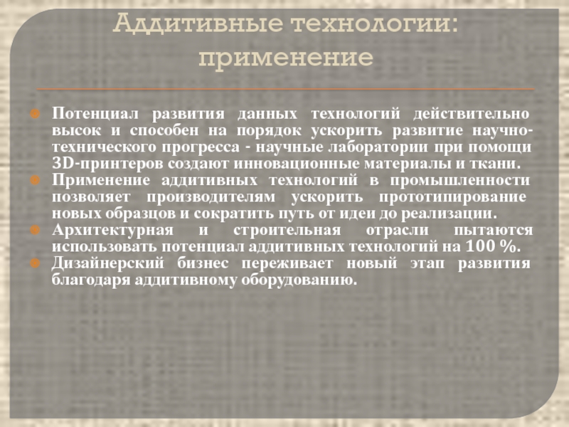 Аддитивные технологии: применение Потенциал развития данных технологий действительно высок и способен на порядок ускорить развитие научно-технического прогресса