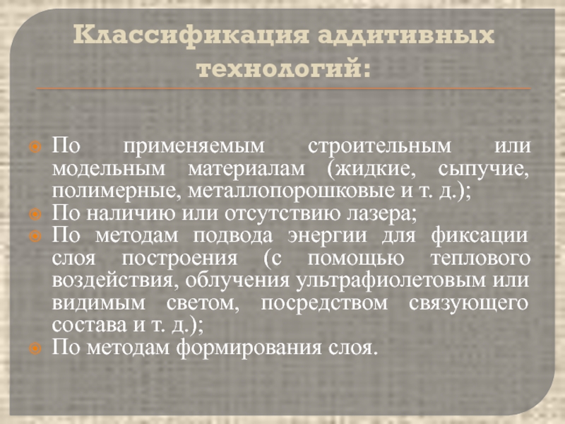 Классификация аддитивных технологий: По применяемым строительным или модельным материалам (жидкие, сыпучие, полимерные, металлопорошковые и т. д.); По наличию или отсутствию лазера; По методам подвода энергии для фиксации слоя построения (с помощью теплового воздействия, облучения ультрафиолетовым