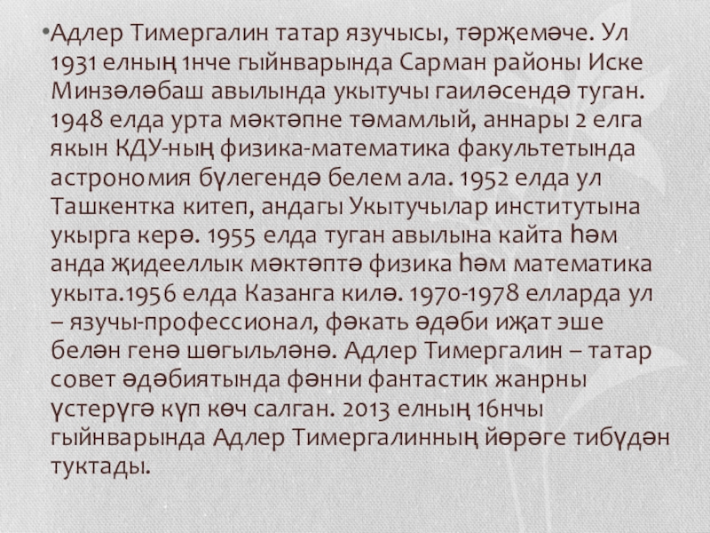 Презентация, доклад на тему Адлер Тимергалин темасына татар әдәбиятыннан презентация