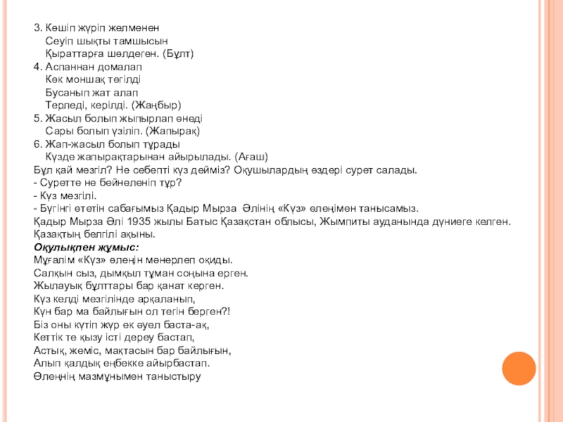 1)Білімділігі: Қ.Мырза Әлінің «Күз» өлеңімен