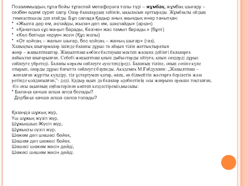 тілін сүюге баулу бесік жырынан бастап бүкіл ауыз әдебиетінің өнегелі өсиеті