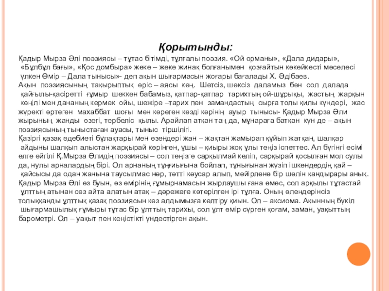 - Қадыр Мырза Әлінің ақындық мұраларының мәні.