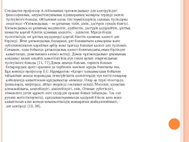 Слайд 8Сондықтан профессор А.Айталының «ұлтжандылық» деп келтіруіндегі