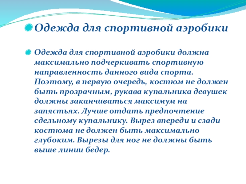 Одежда для спортивной аэробикиОдежда для спортивной аэробики должна максимально подчеркивать спортивную направленность данного вида спорта. Поэтому, в