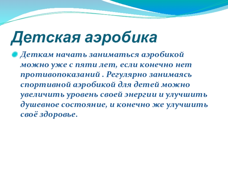 Детская аэробикаДеткам начать заниматься аэробикой можно уже с пяти лет, если конечно нет противопоказаний . Регулярно занимаясь