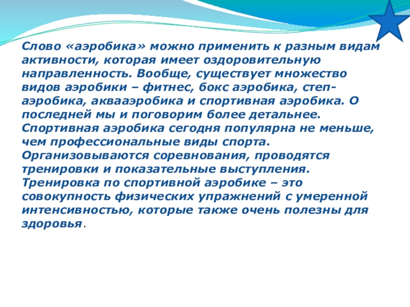 Слайд 3Слово «аэробика» можно применить к разным видам активности, которая имеет оздоровительную