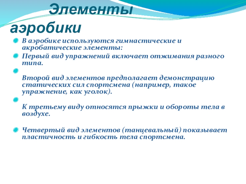 Элементы аэробикиВ аэробике используются гимнастические и акробатические элементы:Первый вид упражнений включает