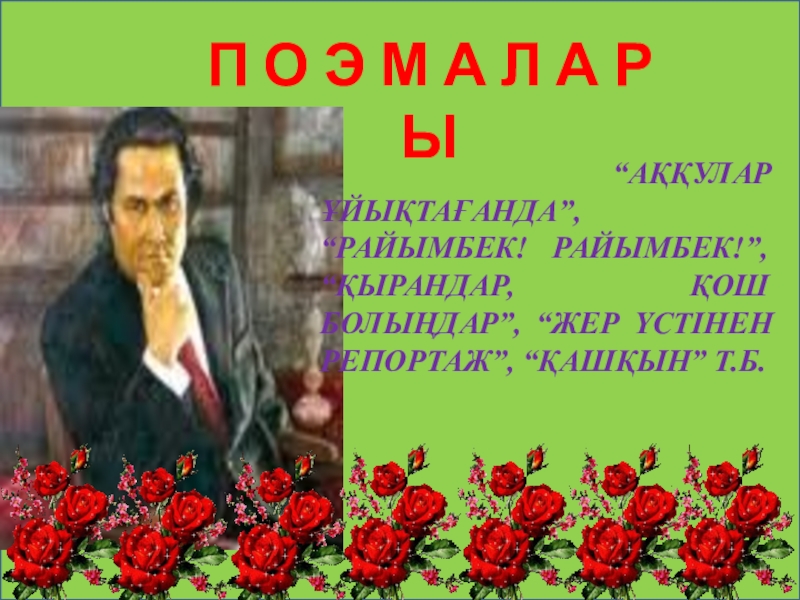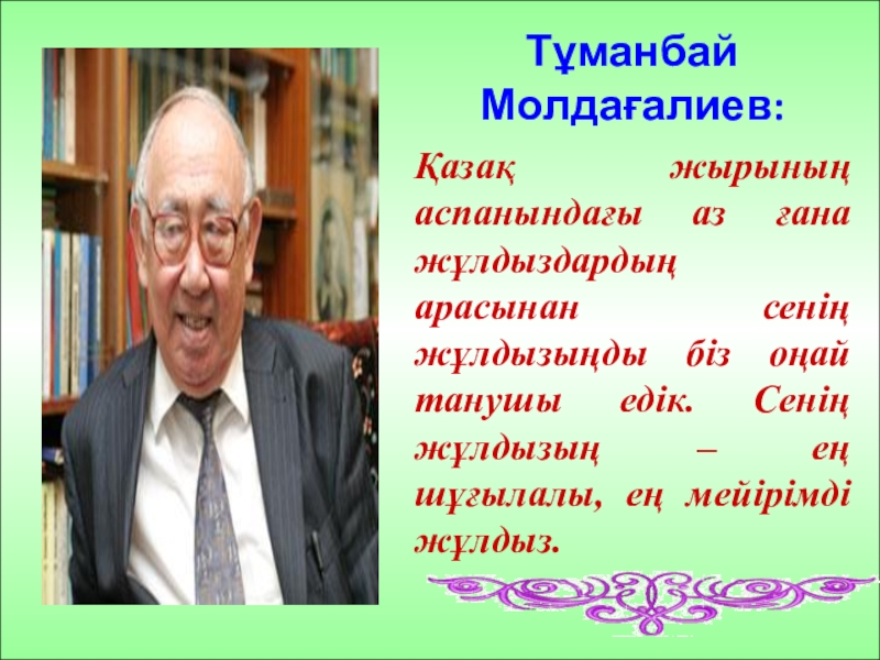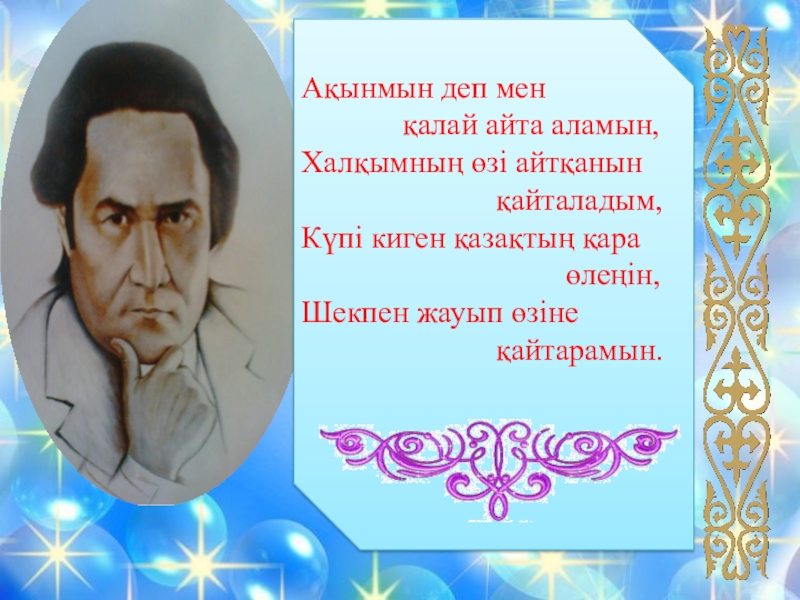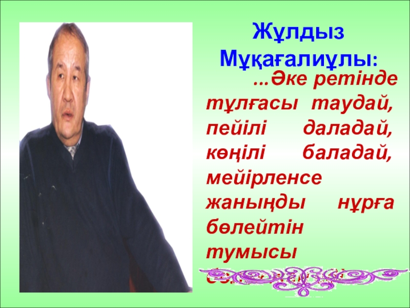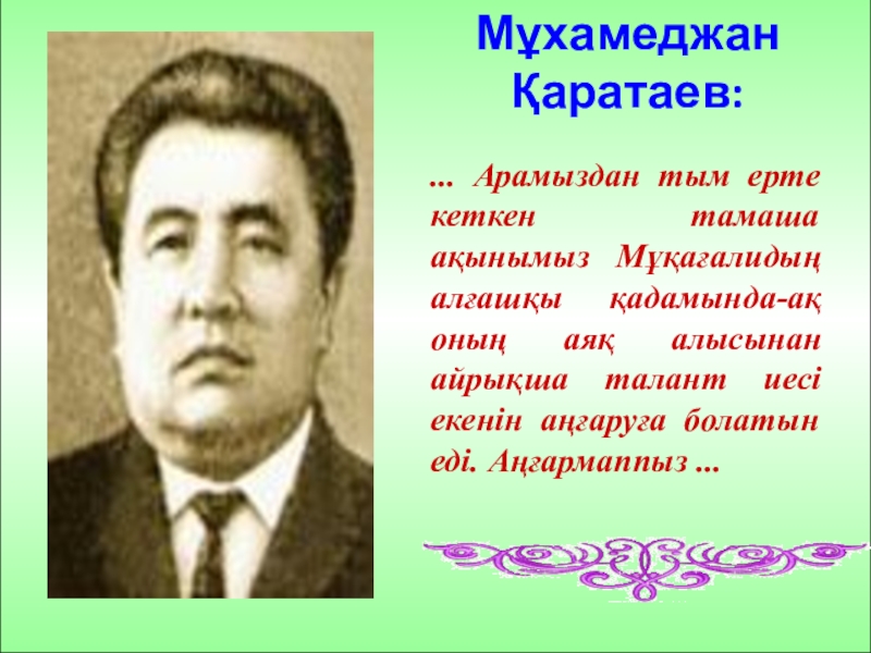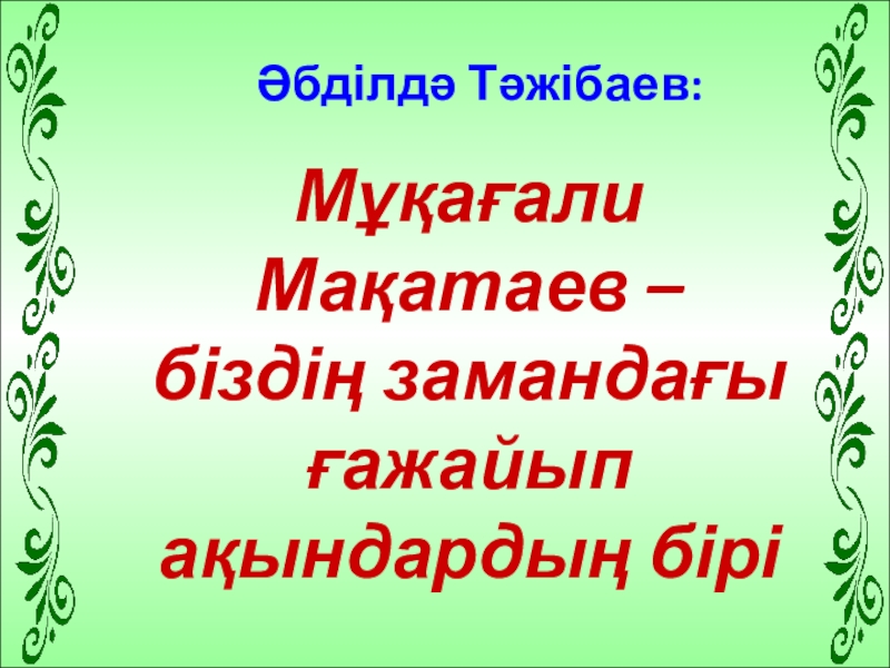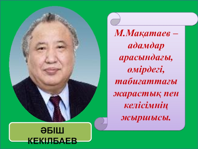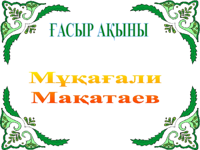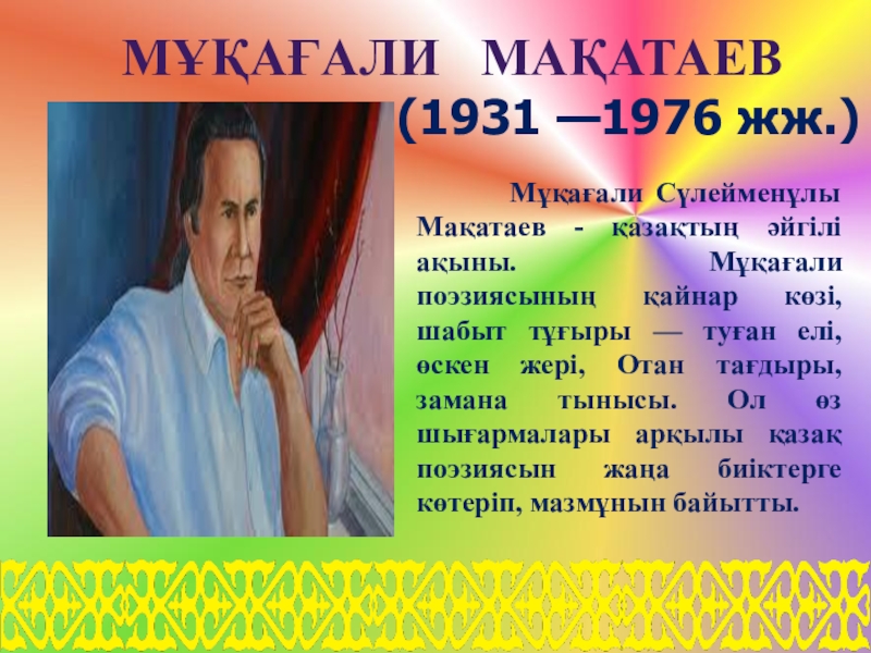 Мұқағали Сүлейменұлы Мақатаев - қазақтың әйгілі ақыны. Мұқағали поэзиясының қайнар көзі, шабыт тұғыры — туған елі, өскен жері, Отан тағдыры, замана тынысы. Ол өз шығармалары арқылы қазақ поэзиясын жаңа биіктерге көтеріп, мазмұнын байытты.