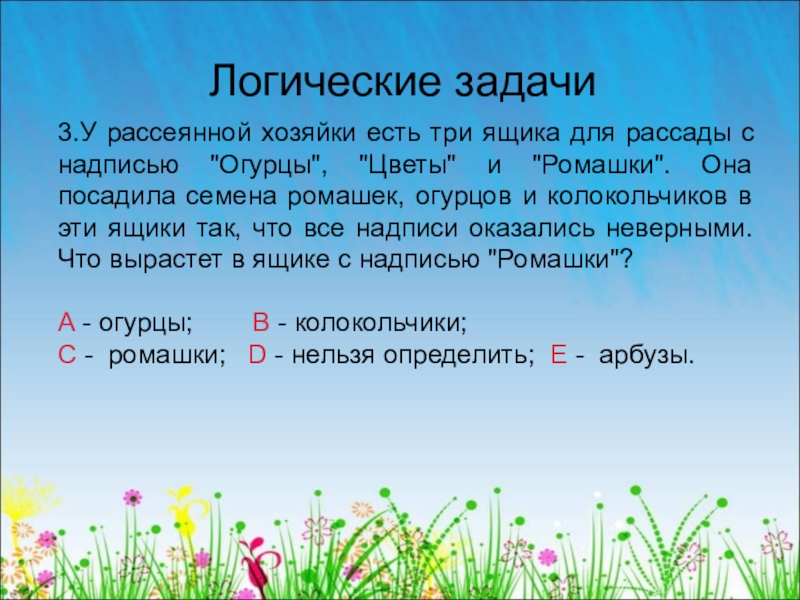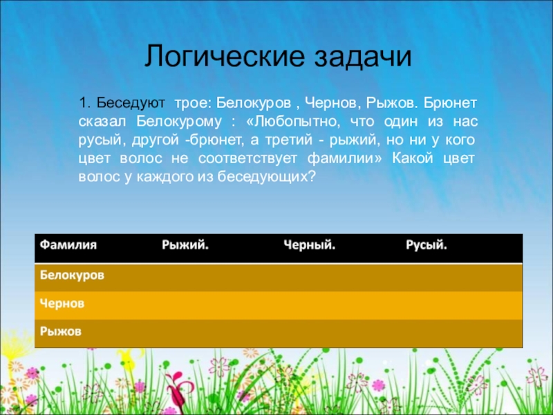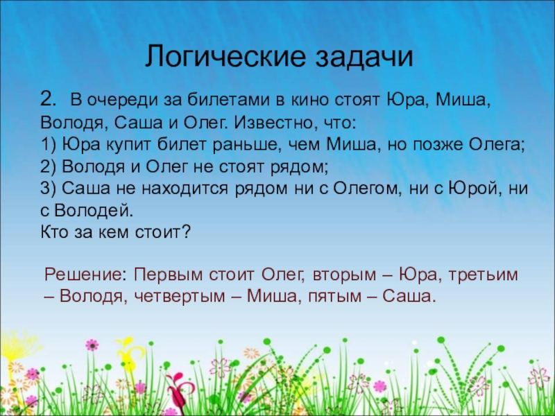Решение: Первым стоит Олег, вторым – Юра, третьим – Володя, четвертым – Миша, пятым – Саша.