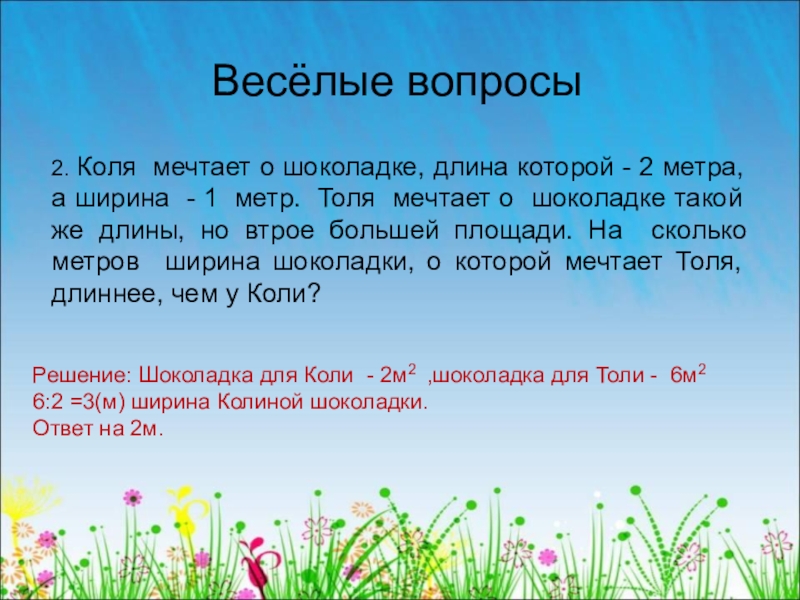 Решение: Шоколадка для Коли - 2м2 ,шоколадка для Толи - 6м2 6:2 =3(м) ширина Колиной шоколадки. Ответ на 2м.