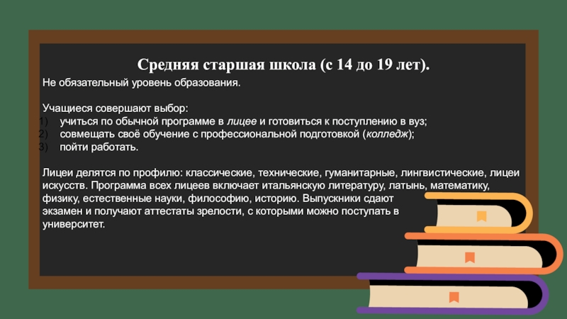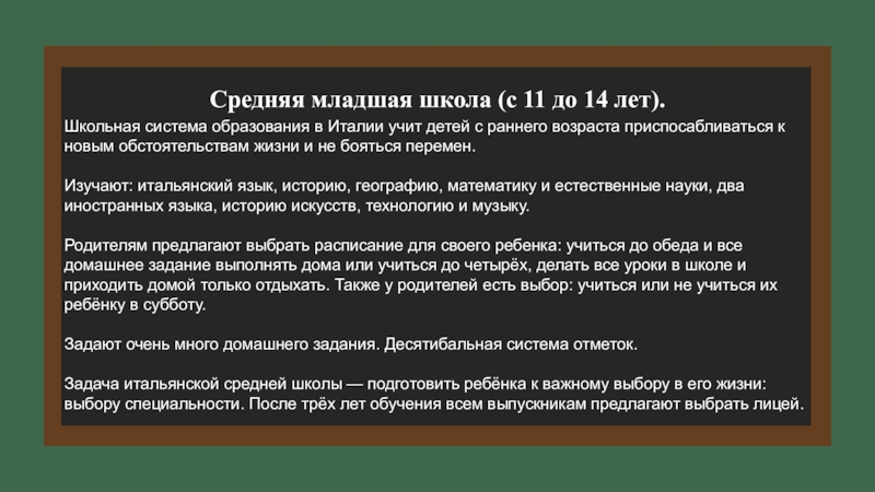Задача итальянской средней школы — подготовить ребёнка к важному выбору в его жизни: выбору специальности. После трёх лет обучения всем выпускникам предлагают выбрать лицей.