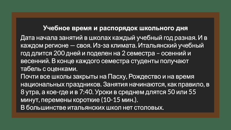 каждом регионе — своя. Из-за климата. Итальянский учебный год длится 200 дней и поделен на 2 семестра – осенний и весенний. В конце каждого семестра студенты получают табель с оценками.