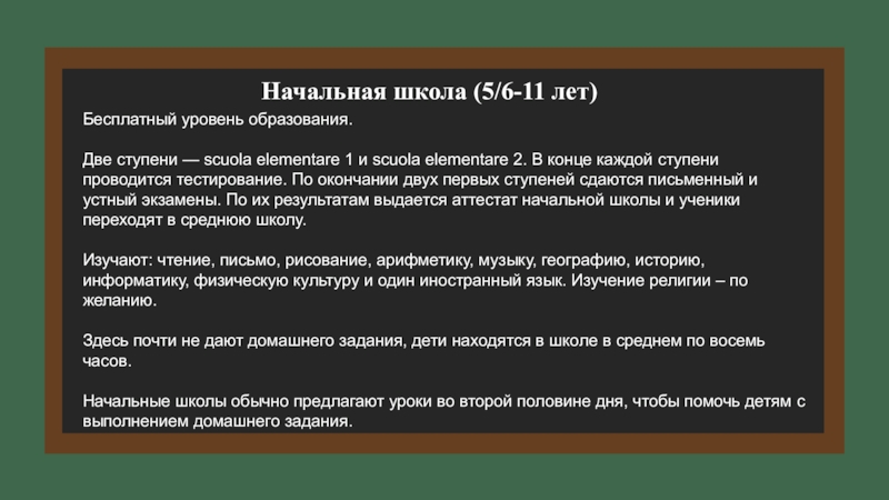 Здесь почти не дают домашнего задания, дети находятся в школе в среднем по восемь часов.