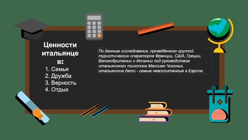 По данным исследования, проведённого группой туристических операторов Франции, США, Греции, Великобритании и Испании под руководством итальянского психолога Массимо Чиконья, итальянские дети - самые невоспитанные в Европе.