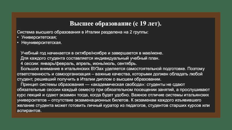 Принцип системы образования — «академическая свобода»: студенты не сдают обязательные сессии каждый семестр при обязательном посещении занятий, а прослушивают курс лекций и сдают экзамен тогда, когда будет удобно. Важное отличие системы итальянских университетов – отсутствие экзаменационных билетов. К экзаменам каждого изъявившего желание студента может готовить личный куратор из педагогов, студентов старших курсов или аспирантов.