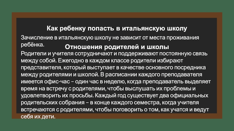 Слайд 13Зачисление в итальянскую школу не зависит от места проживания ребёнка.