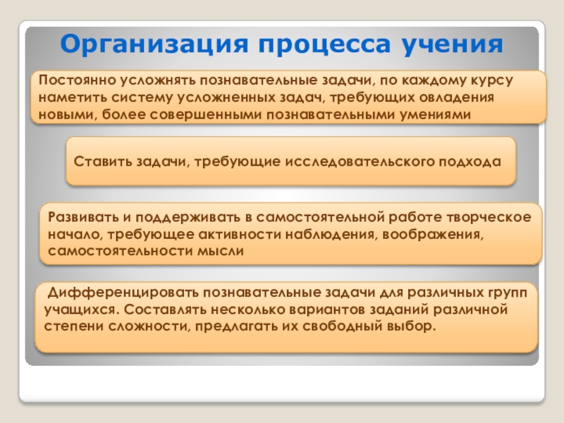 Дифференцировать познавательные задачи для различных групп учащихся. Составлять несколько вариантов заданий различной степени сложности, предлагать их свободный выбор.