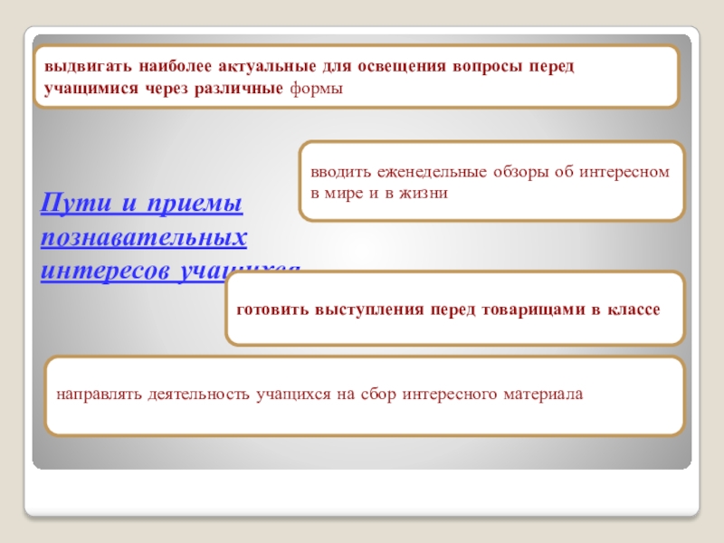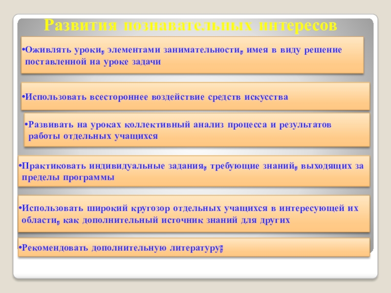 Использовать широкий кругозор отдельных учащихся в интересующей их области, как дополнительный источник знаний для других