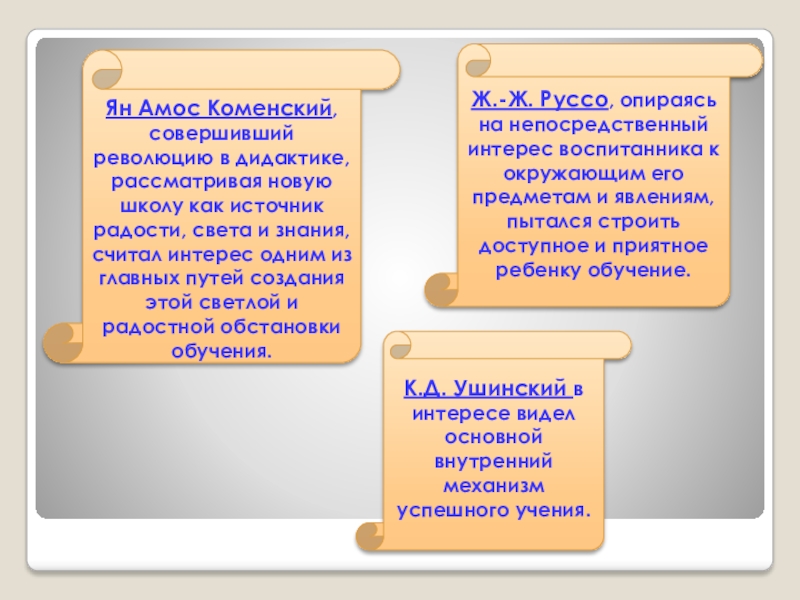 Ж.-Ж. Руссо, опираясь на непосредственный интерес воспитанника к окружающим его предметам и явлениям, пытался строить доступное и приятное ребенку обучение.