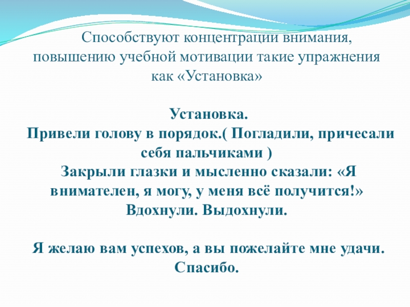 Слайд 10 Способствуют концентрации внимания, повышению учебной мотивации такие упражнения как «Установка»