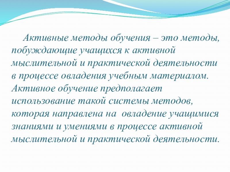 и практической деятельности в процессе овладения учебным материалом. Активное обучение предполагает использование такой системы методов, которая направлена на овладение учащимися знаниями и умениями в процессе активной мыслительной и практической деятельности.