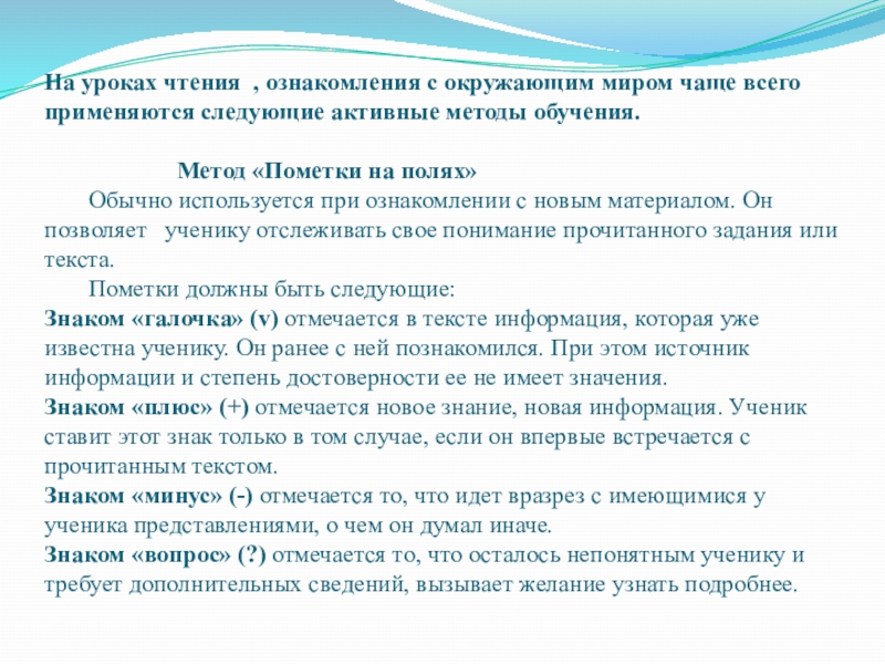 и внимательного. Он обязывает не просто читать, а вчитываться в текст, отслеживать собственное понимание в процессе чтения текста или восприятия любой иной информации. На практике ученики просто пропускают то, что не поняли. И в данном случае маркировочный знак «вопрос» обязывает их быть внимательным и отмечать непонятное. Использование маркировочных знаков позволяет соотносить новую информацию с имеющимися представлениями.