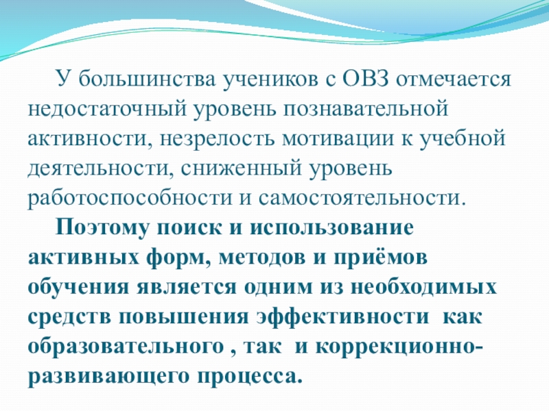 Слайд 6 У большинства учеников с ОВЗ отмечается недостаточный уровень познавательной активности, незрелость