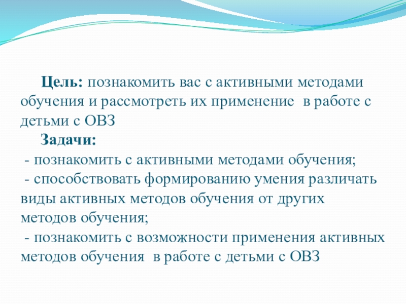 - познакомить с возможности применения активных методов обучения в работе с детьми с ОВЗ