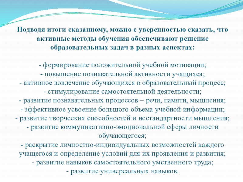 Слайд 19Подводя итоги сказанному, можно с уверенностью сказать, что активные методы обучения
