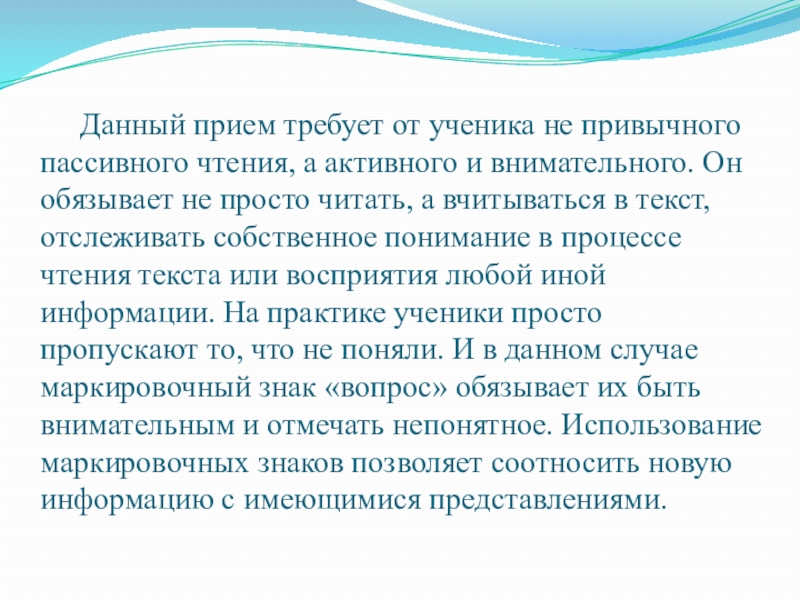 Слайд 13 Данный прием требует от ученика не привычного пассивного чтения, а активного