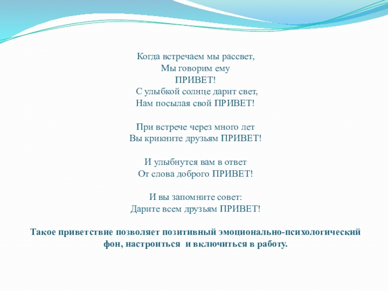 Такое приветствие позволяет позитивный эмоционально-психологический фон, настроиться и включиться в работу.