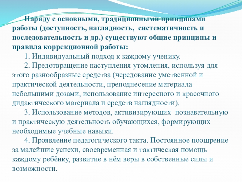 Слайд 7 Наряду с основными, традиционными принципами работы (доступность, наглядность, систематичность и последовательность